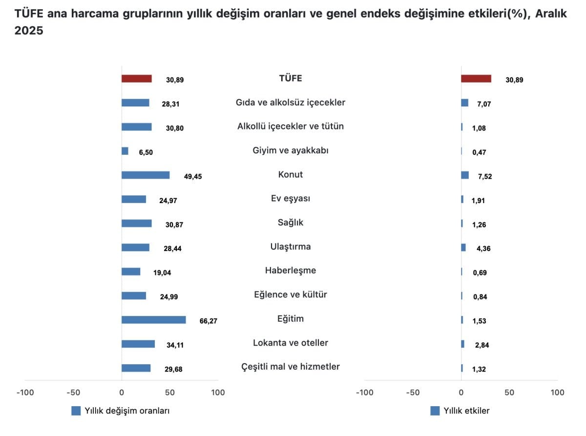 TÜFE'deki değişim 2025 yılı Aralık ayında bir önceki aya göre yüzde 0,89 artış, bir önceki yılın Aralık ayına göre yüzde 30,89 artış, bir önceki yılın aynı ayına göre yüzde 30,89 artış ve on iki aylık ortalamalara göre yüzde 34,88 artış olarak gerçekleşti.